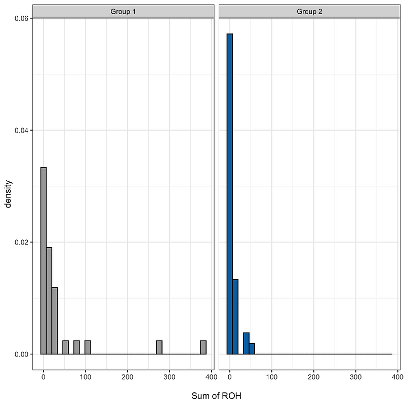 Long runs of homozygosity (ROH) are often caused by "close" genetic relatedness between parents. ROH can be used to investigate inbreeding in populations, causes of complicated pedigree reconstruction and overall population sizes. ROH can also be viewed through two characteristics: (a) what proportion of the population yields no evidence of ROH, and (b) what is the mean ROH in a population?